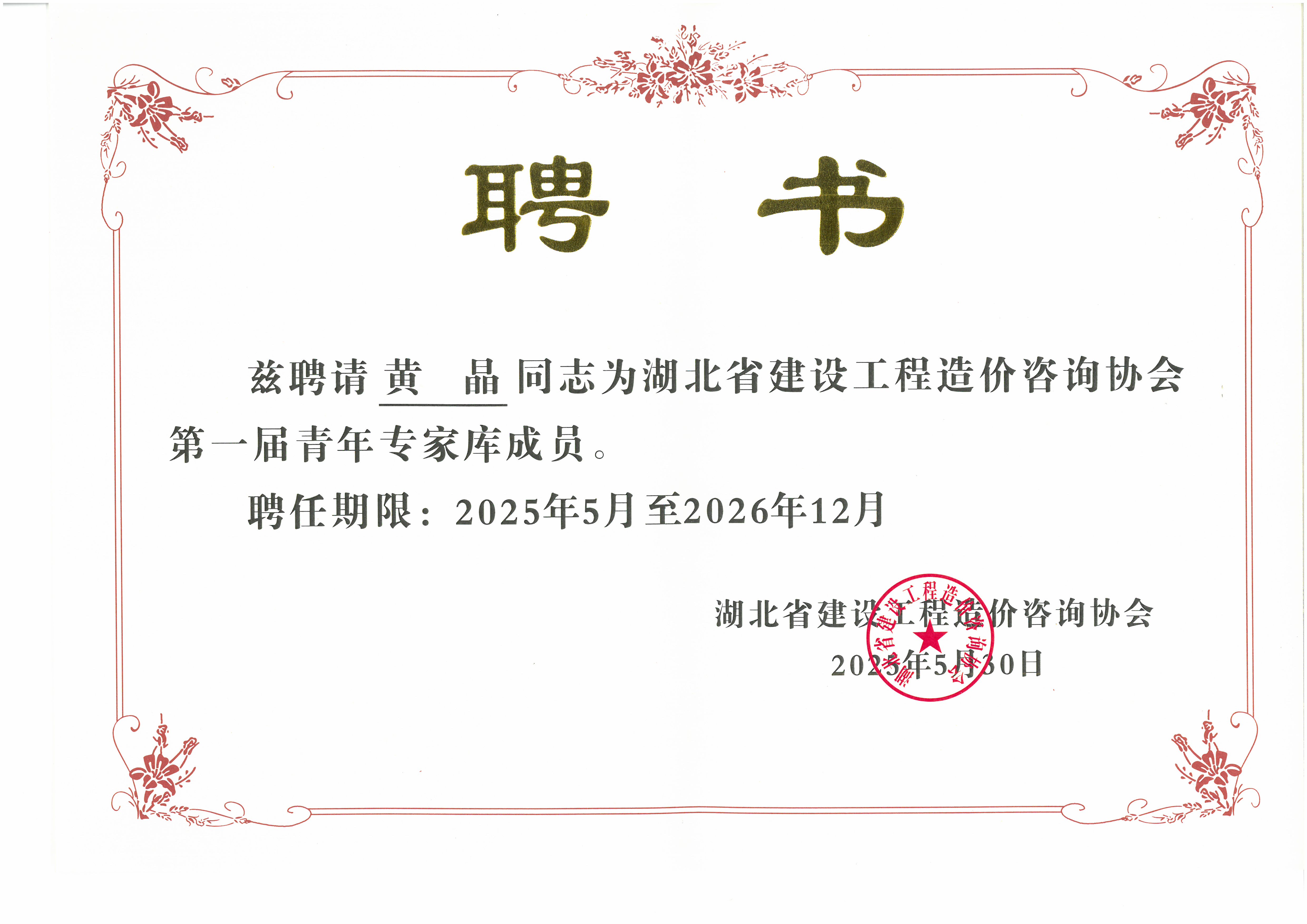此次入選湖北省建設(shè)工程造價咨詢協(xié)會第一屆青年專家?guī)?,不僅是對黃晶個人專業(yè)能力的高度認(rèn)可,更是對我司在工程造價領(lǐng)域?qū)I(yè)水平的肯定。這既是一份榮譽,更是一份責(zé)任。